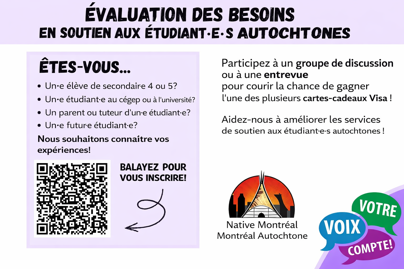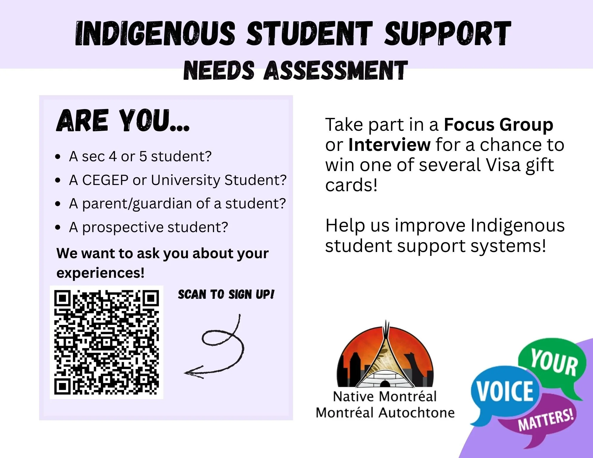 Your input will allow Native Montreal to support Indigenous students in the Greater Montreal Area by providing guidance and services important to YOU.